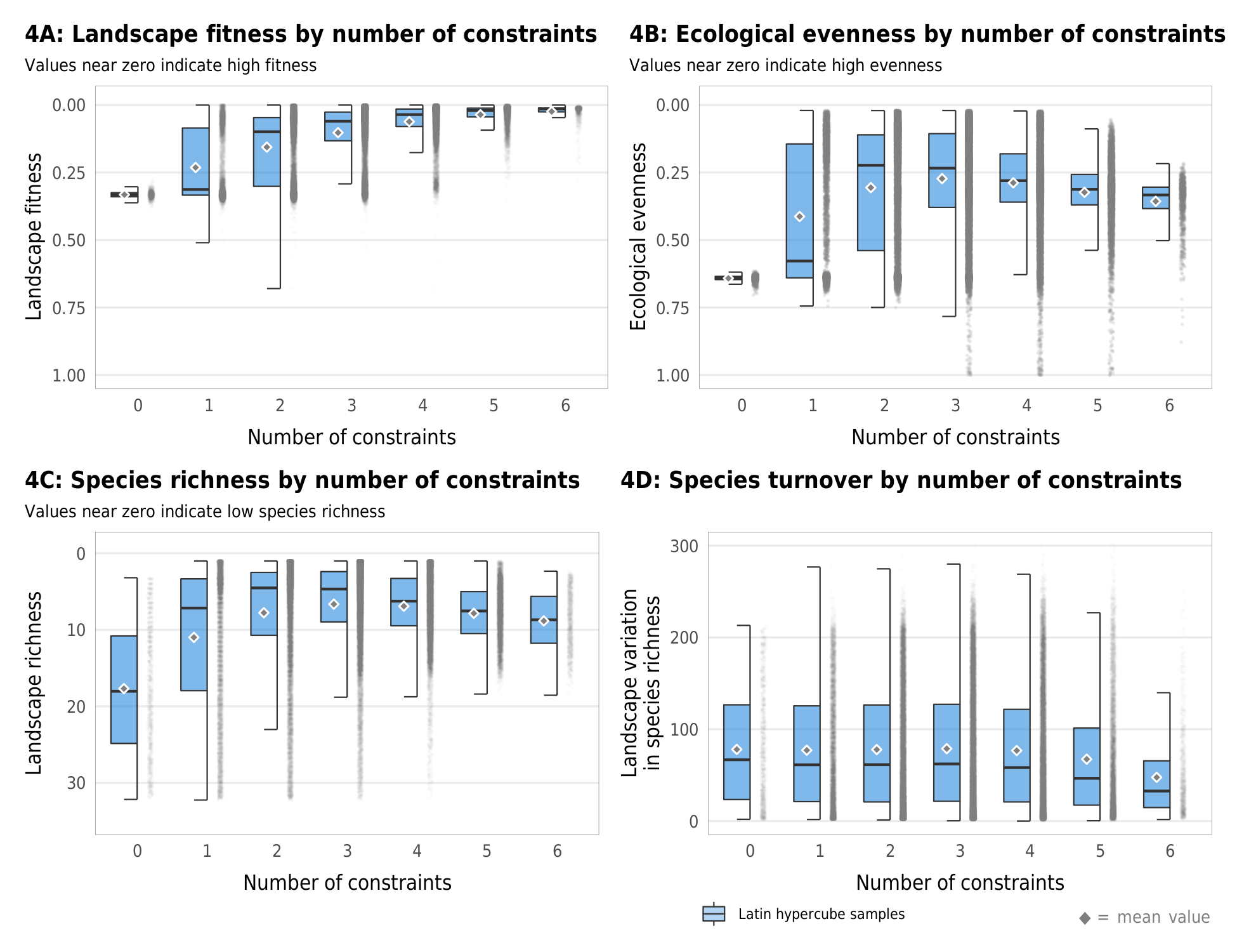 Figure 4: Boxplots show ecological measures across parameter space for different numbers of constraints generated by 2000 iterations of the simulation model across all 64 possible permutations of the proposed constraints being present or absent, and with uniform random values of parameters pulled from their possible values in the model iterations. The whiskers in the box plot show the range of variation. The actual data used to construct the boxplots are shown as fine gray dots to the right of each box plot. (a) Effect of the number of constraints on landscape fitness. (b) Effect of the number of constraints on ecological evenness. (c) Effect of the number of constraints on the average cell species richness (number of species defined as functional groups) present in the cell-niche. (d) Effect of the number of constraints on the difference between turnover in mutualistic linked and unlinked species. The turnover rate is the number of new species created at each time step in each cell.