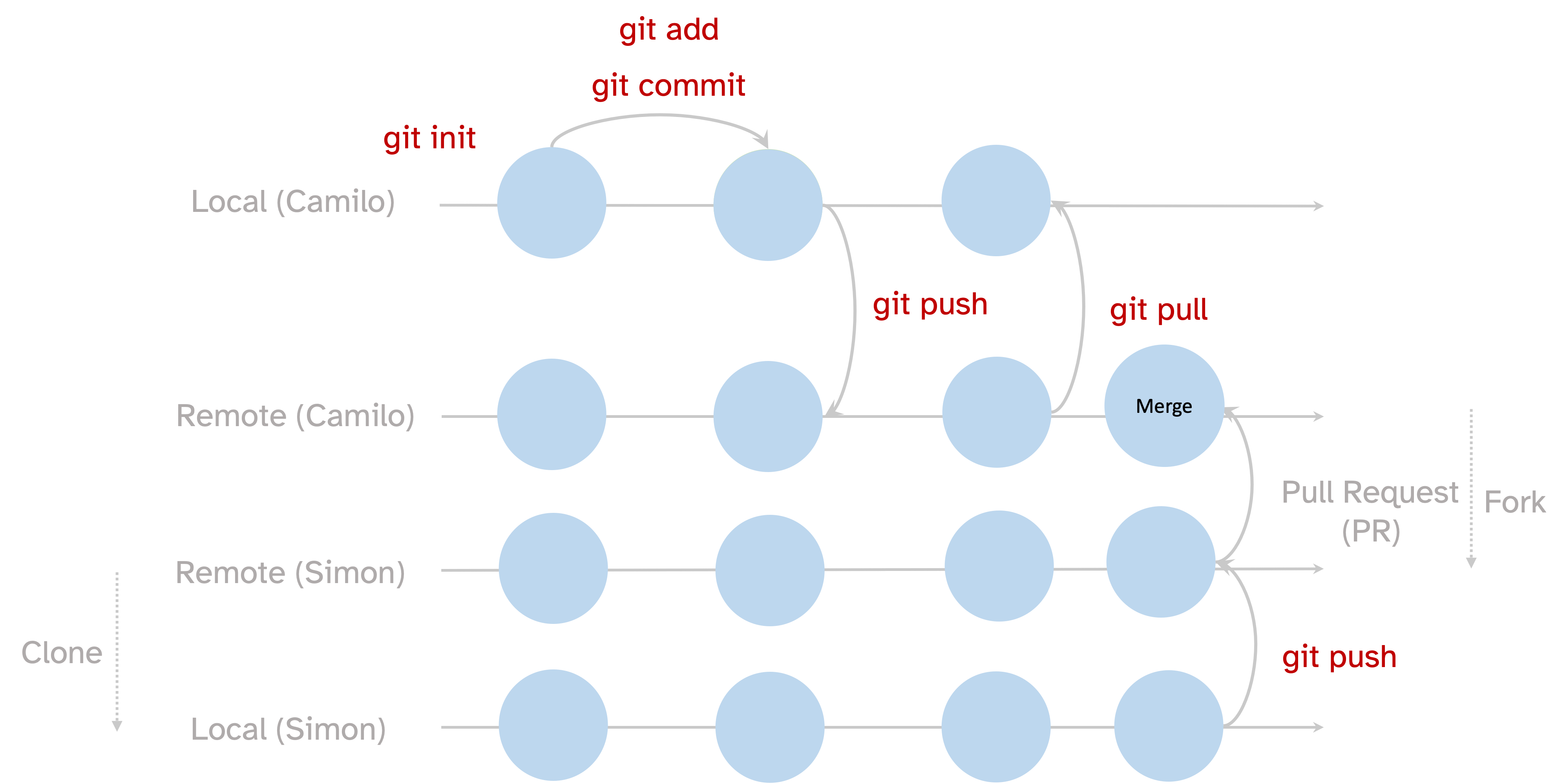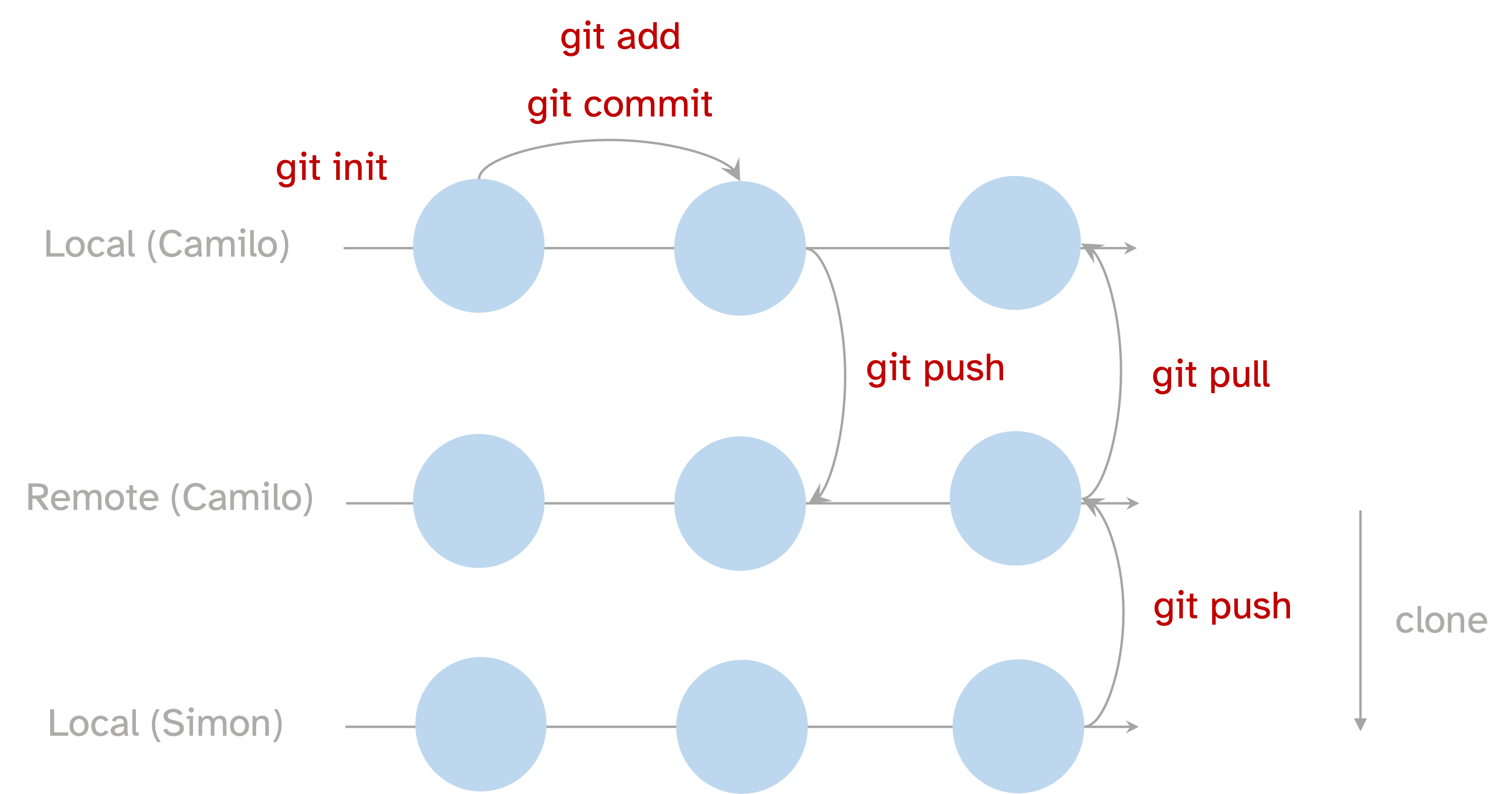 To enable the communication with a remote repo, git has encoded many specific commands, once the repos are cloned a simple workflow from the own local and remote repos is made possible thanks to two simple commands git push and git pull.