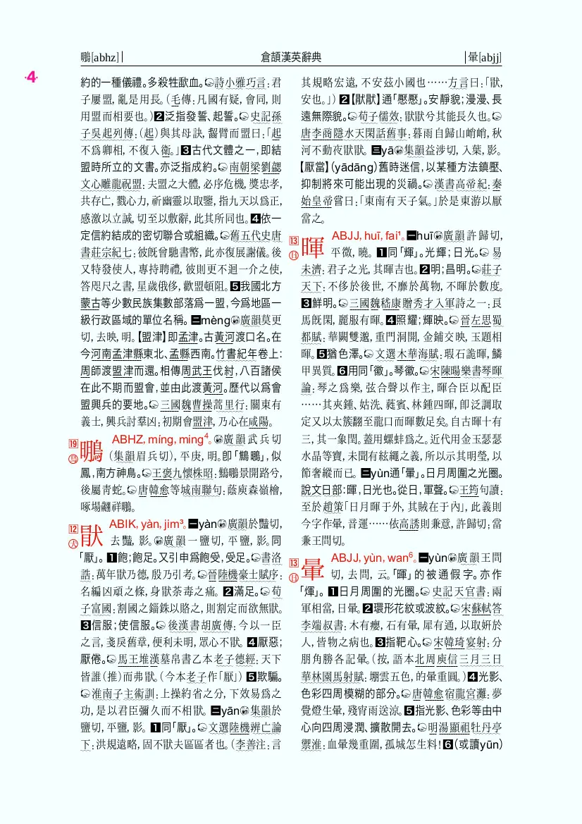 - 字頭右方依次爲本字頭的「第六代倉頡碼」(Cangjie Input Code)、「四角碼」(Sijiao or Four Corner Code)、當代國語讀音(mandarin pronunciation)、粵拼(Cantonese pronunciation)。當然,這些可以換成其他信息,如粵拼換成上古音信息之類,也可以修改源碼添加標記信息。