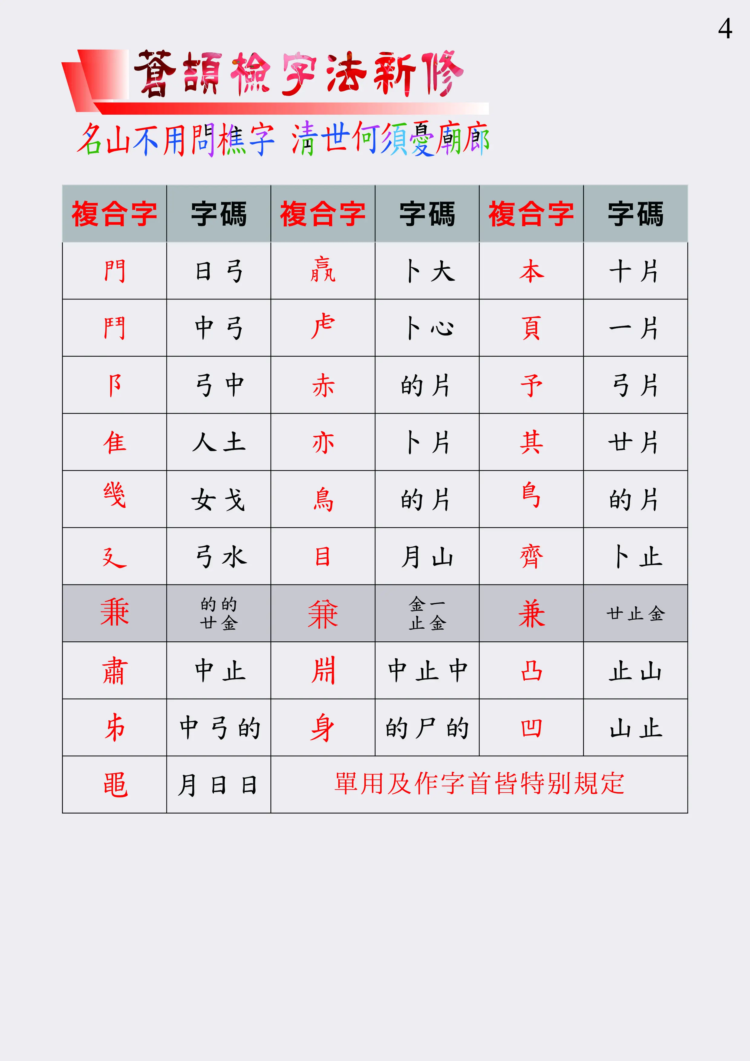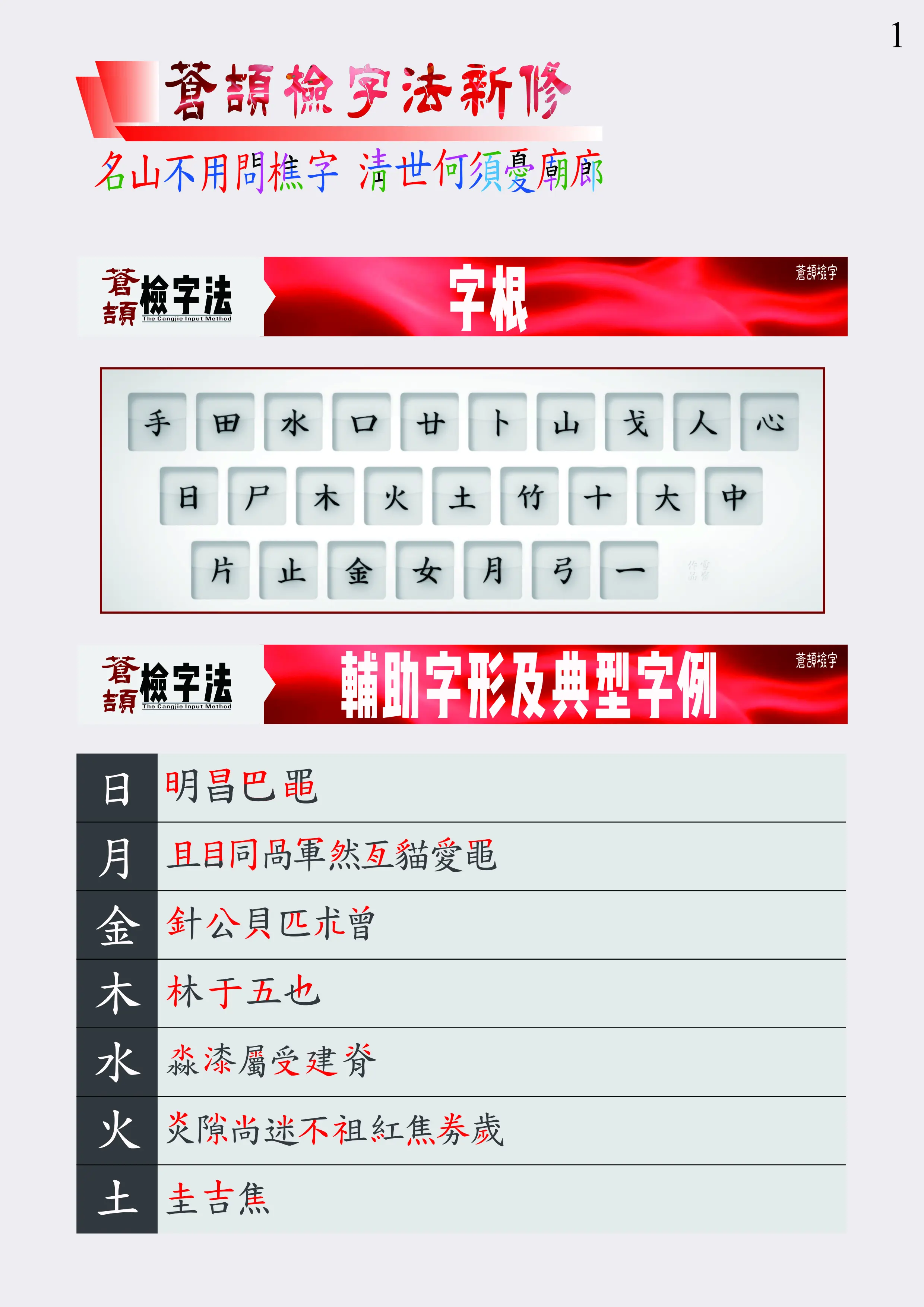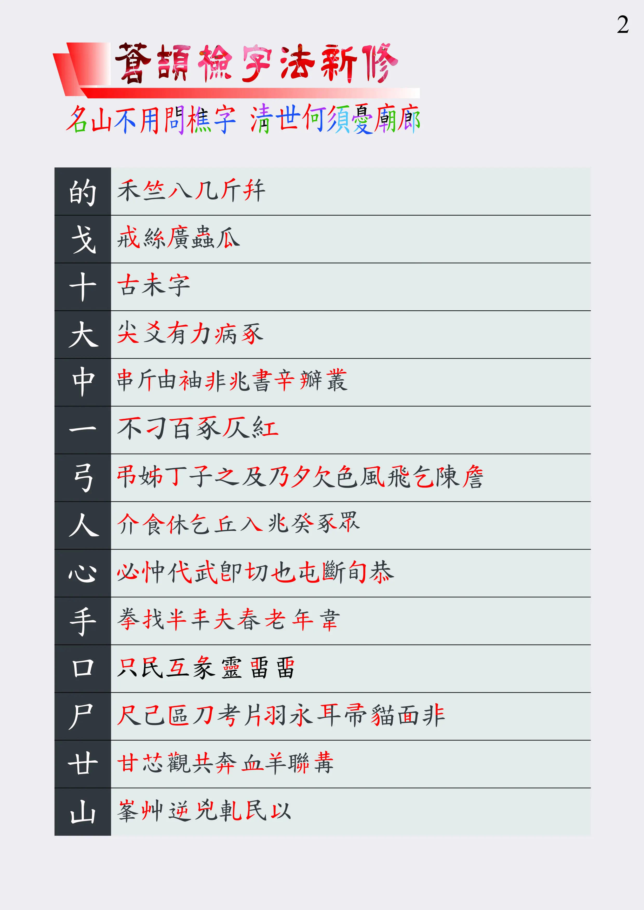 僕在工廠務工,偶然需要使用 CorelDraw 排版些圖文。遂突發奇想,以此物採笨辦法打散漢字,拆筆畫手動着色,製作蒼頡檢字法五頁簡易入門文檔,僅供習者參考。全文圖片格式,手機愼入。